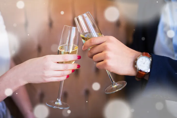 Pop the cork, pour bubbly into two champagne flutes. Cheers!